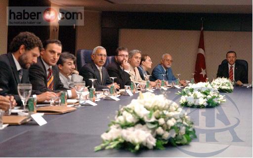 Başbakan Recep Tayyip Erdoğan, bir süre önce yayınladıkları bildiriyle terör örgütü PKK’ya (silah bırakma) çağrısı yapan bildiriyi imzalayan 'bir grup aydını' Başbakanlık yeni binada kabul etti. 12 aydın (soldan sağa) Osman Kavala, Mustafa Karaalioğlu, Yılmaz Ensaroğlu, Oral Çalışlar, Ahmet Hakan Coşkun, Ali Bayramoğlu, Adalet Ağaoğlu ve Gencay Gürsoy.. (10/08/200)