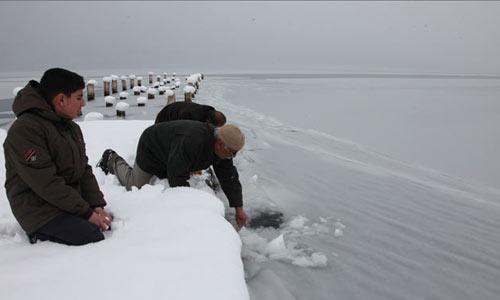 Van Gölü sahilinde bulunan Bitlis'in Ahlat ilçesinde göl üzerinde büyük bir alanda oluşan kar katmanları, ilçe halkını şaşırttı.