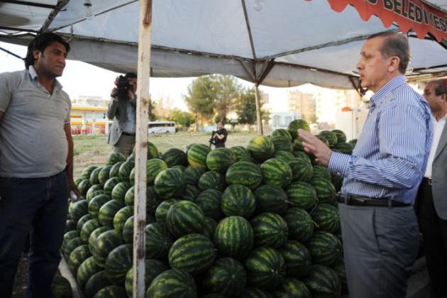 Başbakan Erdoğan, Şanlıurfa'da şehir turu yaparken vatandaşlarla sohbet etti. Başbakan Erdoğan karpuz satan esnaftan karpuz satın aldı.