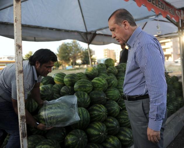 Başbakan Erdoğan, Şanlıurfa'da şehir turu yaparken vatandaşlarla sohbet etti. Başbakan Erdoğan karpuz satan esnaftan karpuz satın aldı.