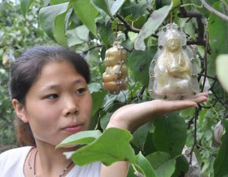 Çiftçi, ağaçtaki büyümekte olan armutların üzerine kalıplar yerleştirdi.