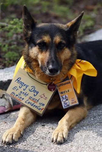 Aktivist köpek 'Nele' boynundaki 'Kızgın köpek! Bu grev benim şekerlemelerimle de ilgili' yazılı pankartla Lufthansa grevindeki protestocuları destekliyor. Almanya