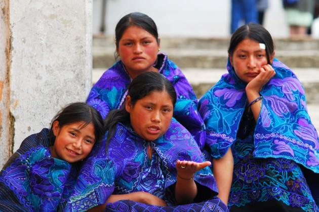 Meksika, Zinacantan (Chiapas Eyaleti): Yoğun mavi ve mor renkli kıyafetleriyle merdivenlerde otururken aralarından biri yaptığı el hareketiyle para istiyor. Bu kare Ayrı Bir Dünya'dan.