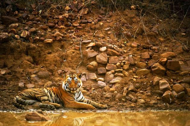 Tadoba Milli Parkı, Maharashtra, Hindistan: Çamurlu bir gölcük kenarında uzanan kaplan ve sudaki yansıması. Vahşi Hindistan'ın Sırları belgeselinden.