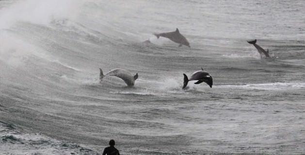 Sörfçülerin arasına giren yunuslar
