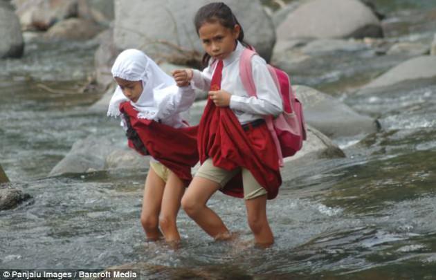 Tellerden geçmeye cesaret edemeyen bazı çocuklar nehrin sığ olduğu yerlerden buz gibi suları yararak karşıya geçmeye çalışıyor.