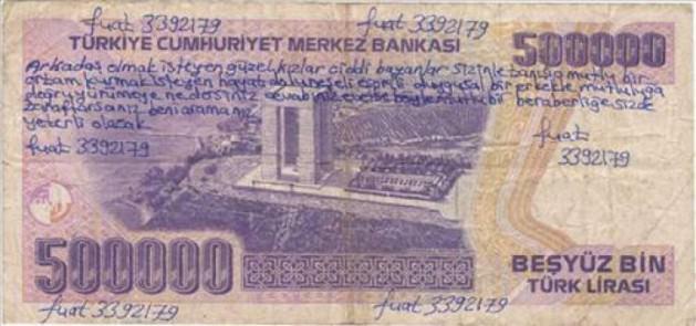 Kağıt paraların üzerine not alır ve parayı harcadığı için notu kaybeder ve ya elden ele dolasacağını bildiğinden komik yazılar yazar. ( Paranın ön yüzüne tehlike anında arkayı çeviriniz yazıp anında çevirince de şimdi değil salak tehlike anında yazanlardan bahsediyoruz.)