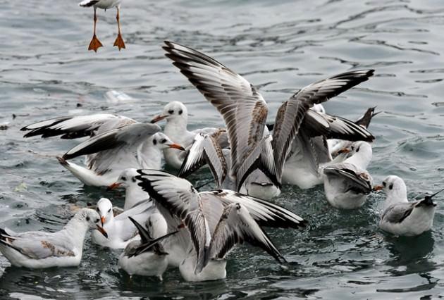 Aç kalan martılar Boğazın yüzeyindeki atıkların arasında buldukları ekmek ve simit parçalarını kapabilmek için birbirleriyle yarıştı.