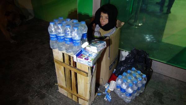 İlköğretim öğrencisi soğuklardan korunmak için karton kutunun içine giriyor.