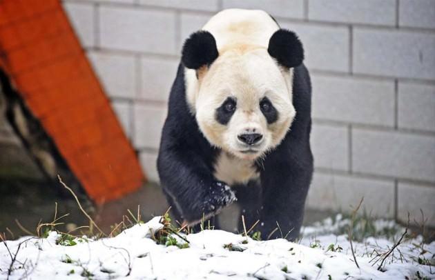 Çin'deki Wuhan hayvanat bahçesinde yaşayan dev panda, kar yağışını takla atarak kutladı.