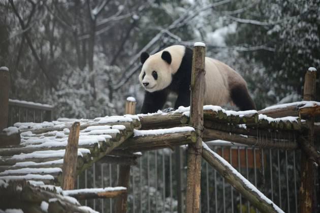 Çin'deki Wuhan hayvanat bahçesinde yaşayan dev panda, kar yağışını takla atarak kutladı.