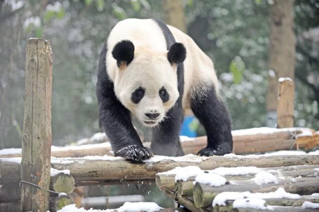 Çin'deki Wuhan hayvanat bahçesinde yaşayan dev panda, kar yağışını takla atarak kutladı.