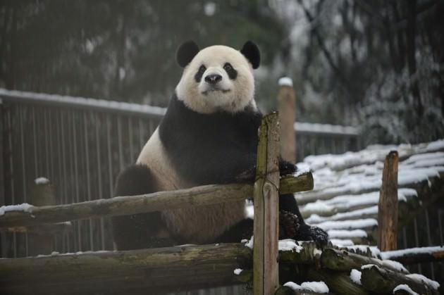 Çin'deki Wuhan hayvanat bahçesinde yaşayan dev panda, kar yağışını takla atarak kutladı.