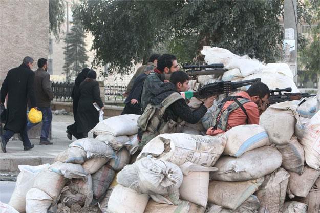 Esed güçleriyle muhalifler arasında şiddetli çatışmalara sahne olan Halep kentinden gelen fotoğraflar, yaşam ve savaşın acı yüzünü gözler önüne serdi. Muhalifler sokak ortasına kurdukları mevziden rejim güçlerine ateş ederken, geri planda evlerine erzak götürmeye çalışan Haleplileri görmek mümkün.
