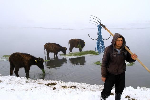 Van'ın Çaldıran ilçesi köylerinde yaşayan çiftçiler, kış aylarında hayvanlarının karınlarını doyurmakta zorlanınca gölden çıkan otları değerlendiriyorlar