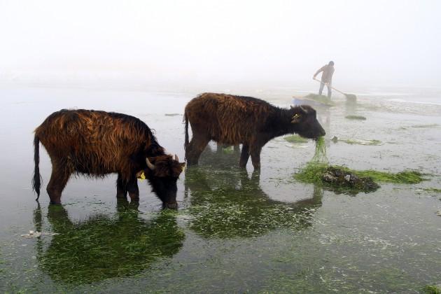 Van'ın Çaldıran ilçesi köylerinde yaşayan çiftçiler, kış aylarında hayvanlarının karınlarını doyurmakta zorlanınca gölden çıkan otları değerlendiriyorlar