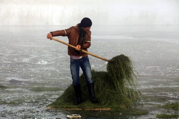 Van'ın Çaldıran ilçesi köylerinde yaşayan çiftçiler, kış aylarında hayvanlarının karınlarını doyurmakta zorlanınca gölden çıkan otları değerlendiriyorlar