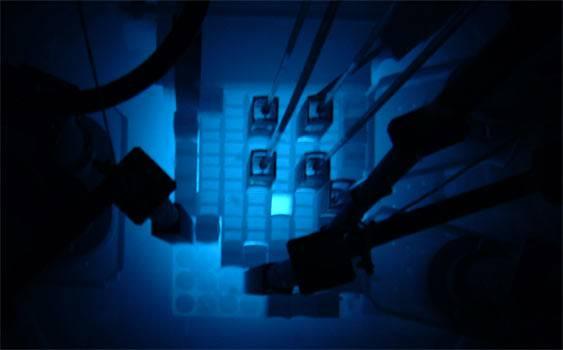 Yakıt çubuğunu çevreleyen mavi renk tonu, Cherenkov radyasyonu olarak adlandırılıyor