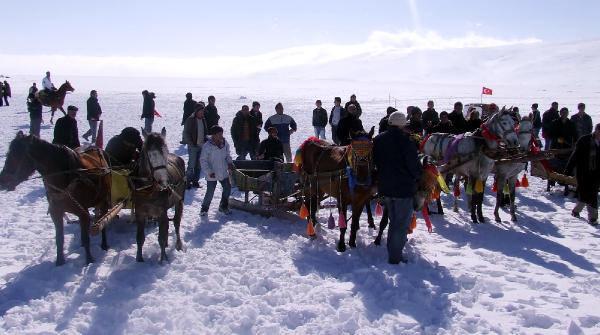 Buzla kaplı gölde atlı kış şöleni