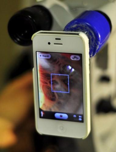 Göz hastalıkları uzmanı Doç.Dr. Hüseyin Yetik akıllı telefon için geliştirdiği özel ekipman ile göz muayenesi yapıyor.