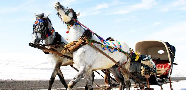 Ardahan'ın Çıldır ilçesinde donan gölde atlı kızak yaparak, yerli ve yabancı turistlerin güzel vakit geçirmesini sağlayan kızakçılar, atlarını birbirinden farklı takılarla güzelleştiriyor.