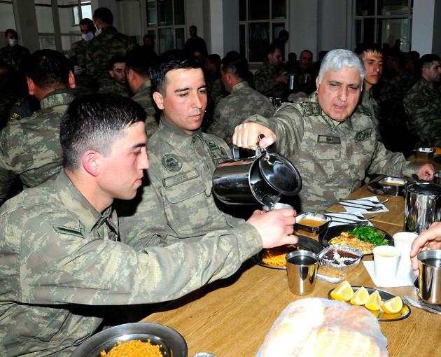 3. Komando Taburu Yemekhanesi'nde er ve erbaşlarla ''mercimek çorbası, elbasan tava, bulgur pilavı, puding ve limonata''dan oluşan karavanadan yiyen Özel, masasına oturduğu askerlerin bardaklarına sürahiden su doldurarak, onlarla sohbet etti.