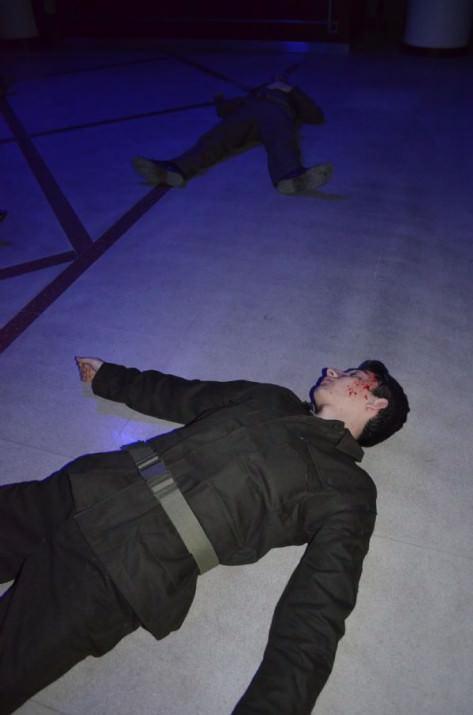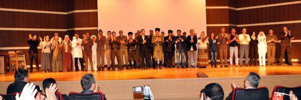 Erzurum'daki Hüseyin Turgut Eğitim Merkezi'nde hizmetiçi eğitim gören infaz koruma memurları, 'Çanakkale 1915' tiyatro gösterisini izlemeye gelenler, koridorlarda yatan ve üzerlerine bayrak serilmiş şehitleri canlandıran ön sahne ile karşılaştı.