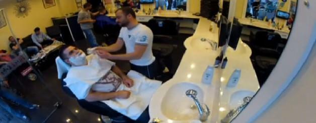 Sakal tıraşı için koltuğa oturan Özsoy 'u hazırlayan Birol Çayan, müşterisinin yüzünü sabunladı.