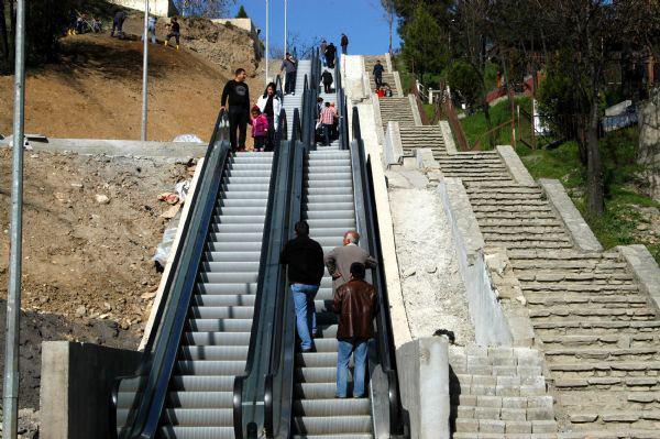 KARABÜK'ün yüksek tepelerine kurulmuş olan mahallelerine her gün 199 merdiven basamağını aşarak çıkıp inen vatandaşlar, artık belediyenin yaptırdığı yürüyen merdivenlerle evlerine gidiyor.