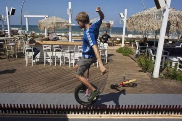 Alman Lutz Eichholz tek tekerlekli bisikletiyle 8.93 metre uzunluğunda 127 bira şişesinin üzerinden geçiyor