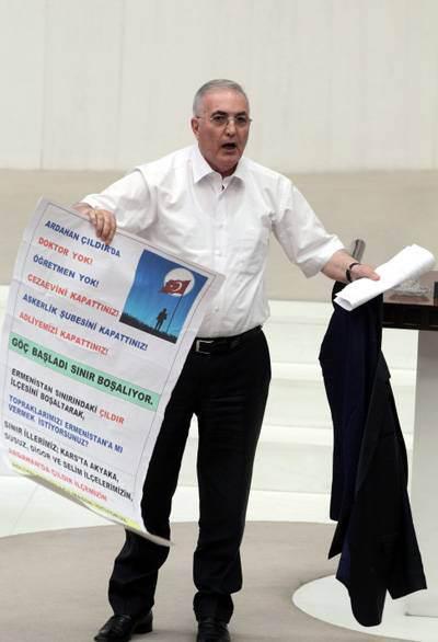 Konuşması sırasında ceketini ve kravatını çıkartan Öğüt, ceketini yere, kravatını da kürsünün üzerine attı.