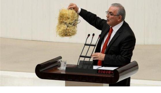 CHP Ardahan Milletvekili Ensar Öğüt, saman fiyatlarının yüksek olmasına tepki göstermek için Meclis kürsüsüne saman getirdi
