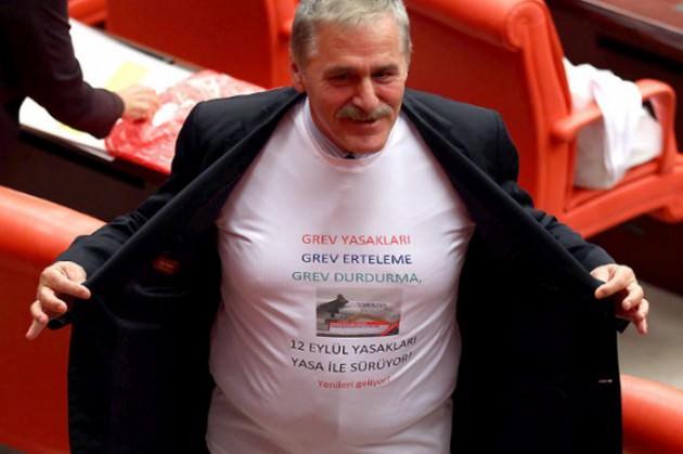 CHP İstanbul milletvekilleri Süleyman Çelebi, AKP sıralarına gelerek milletvekillerine giydiği tişörtü gösterdi.