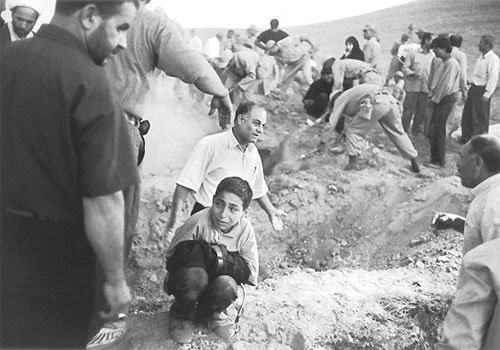 2002 Eric Grigorian, ABD İran'da asker ve köylüler, depremde ölen kurbanlar için mezar kazıyorlar. Bir çocuk ise ölen babasının pantolonuna sıkı sıkı sarılmış, yanıbaşındaki boşluğa babasının gömülmesini bekliyor.