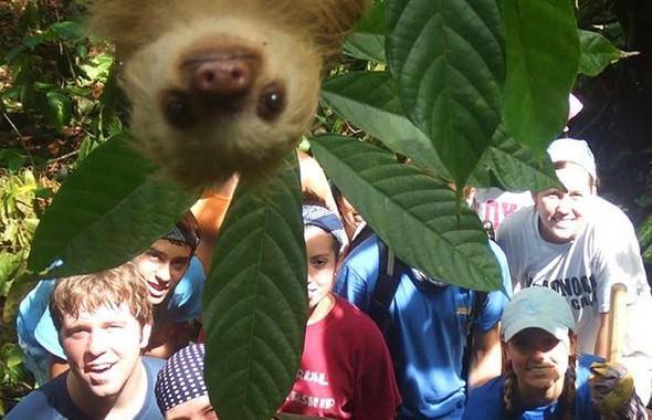 Bir grup öğrencinin fotoğrafını kapatan tembel hayvan.