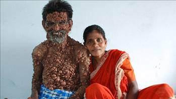 Bir tümör bozukluğundan dolayı vücudunun yüzde doksanı kabarcıklarla kaplı olan 62 yaşındaki Hintli Muhammed, zorlukları eşinin sayesinde aşmış.
