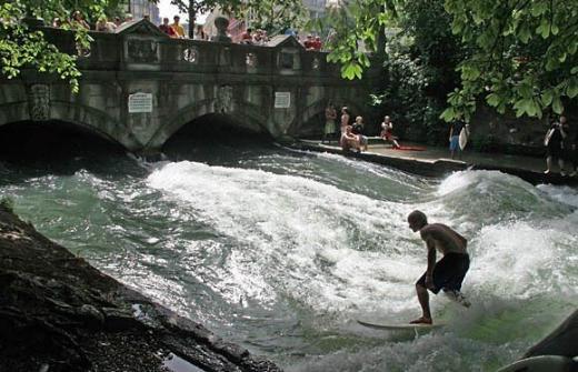 Englischer Garten'ın içinden geçmesi sağlanan Eisbach Nehri üzerindeki suni şelalede sörf yapmak ise Münihli gençler için büyük bir eğlence kaynağı... Turistler için de unutulmaz bir seyir zevki...