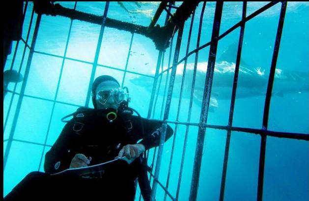 Geçtiğimiz günlerde Güney Afrika sahiline giden ve deniz altına giren 52 yaşındaki Truss, köpekbalıklarıyla karşı karşıya gelerek tuvaline hamle yapıyor.