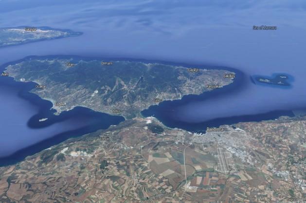 Türkiye'nin en büyük tombolo örneği olan Marmara Kapıdağ yarımadası (tombolo: adanın zamanla karaya bağlanması)
