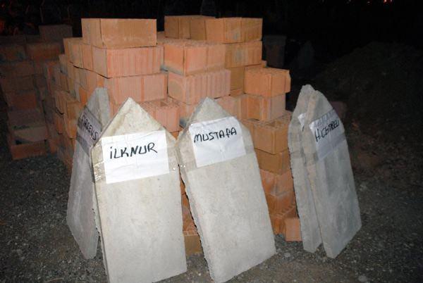 Önceden mezarlığa giden yakınları, hazırladıkları mezar taşlarına ölenlerin isimlerini yazdı.