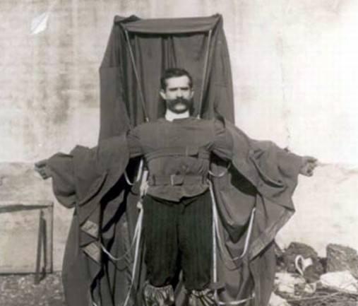 bir palto geliştirdi. Giysisini Eyfel kulesinin ilk güvertesinden, 60 metre yükseklikten denedi. Bir izleyici grubu ve kamera