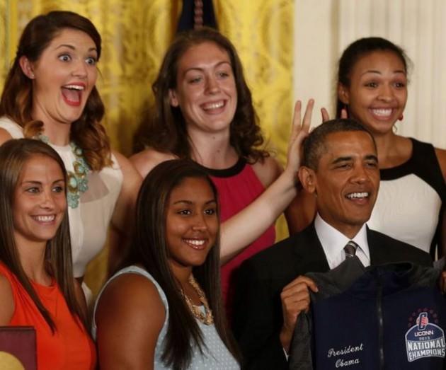 NCAA Kadınlar Ligi'nde şampiyonluğa ulaşan Connecticut Üniversitesi basketbolcuları, ABD Başkanı Barack Obama ile çektirdikleri hatıra fotoğrafında ilginç bir olaya imza attı. Takımın yıldız oyuncularından Stefanie Dolson, fotoğraf çekimi sırasında Barack Obama'ya kulak yaptı...