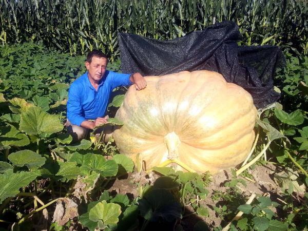 Sakarya'da kuyumcu Fadıl Uzak, Akyazı İlçesi'nde bulunan çiftliğindeki tarlada ABD'den getirdiği tohumla en büyüğü 350 kilo olan dev bal kabakları yetiştirdi.