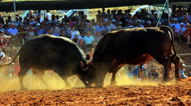 Yerkesik Arenası'nda düzenlenen güreşleri izlemeye gelen yaklaşık 5 bin kişi, kamyon kasaları ve traktör römorklarında boğaların kıran kırana mücadelesini izledi.