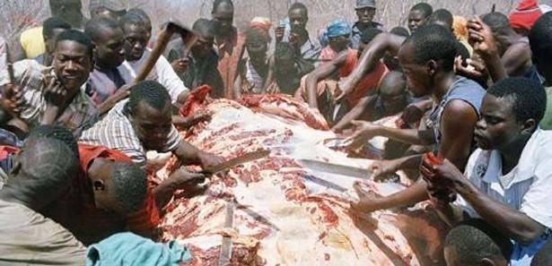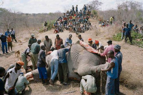 Afrika ülkesi Zimbabve'de çok yaşlı olduğu için ölen fil köylüler ve yüzlerce kişi tarafından bulununca talan edildi.