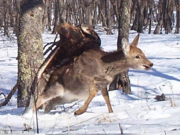Daily Mail'in haberine göre bir Kaya Kartalı'nın, kendisine göre çok büyük bir geyiğe saldırıp götürmesi kameraya takıldı.