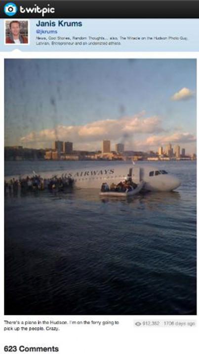 US Airways’a ait yolcu uçağı 15 Ocak 2009’da Hudson Nehri’ne acil iniş yaptığında, kaza, dünya basınına düşmeden 15 dakika önce yolcular tarafından Twitter’da paylaşıldı.