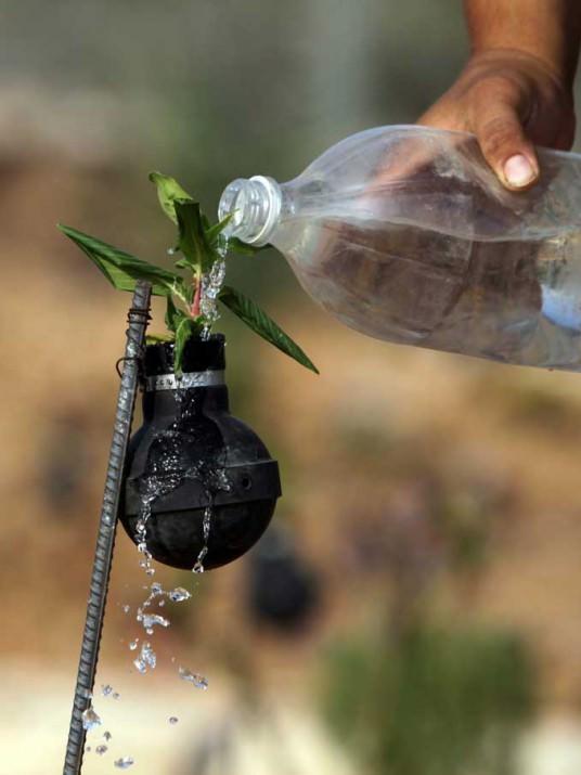 İsrail askerlerinin gaz bombalı müdahalelerinden geriye kalan biber gazı kapsüllerini saklayan köy sakinleri, bu kapsüllerde çiçek yetiştiriyor.