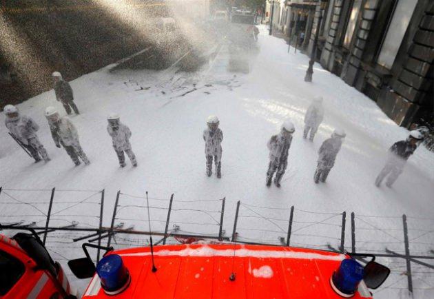 İtfaiyeciler, önce Başbakan Elio Di Rupo`nun çalışma ofisinin bulunduğu caddeye getirdikleri tahtaları ateşe verdi, daha sonra güvenlik önlemi alan polislere köpük sıktı.