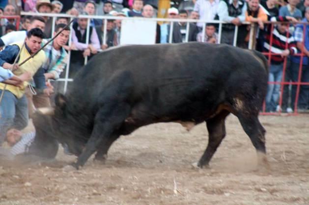 Güreşlerin yapıldığı sırada rakibi ile karşılaşması için arenaya salınan bir boğa rakibi yerine arenadaki değnekçiye yönelince korku dolu anlar yaşandı.
